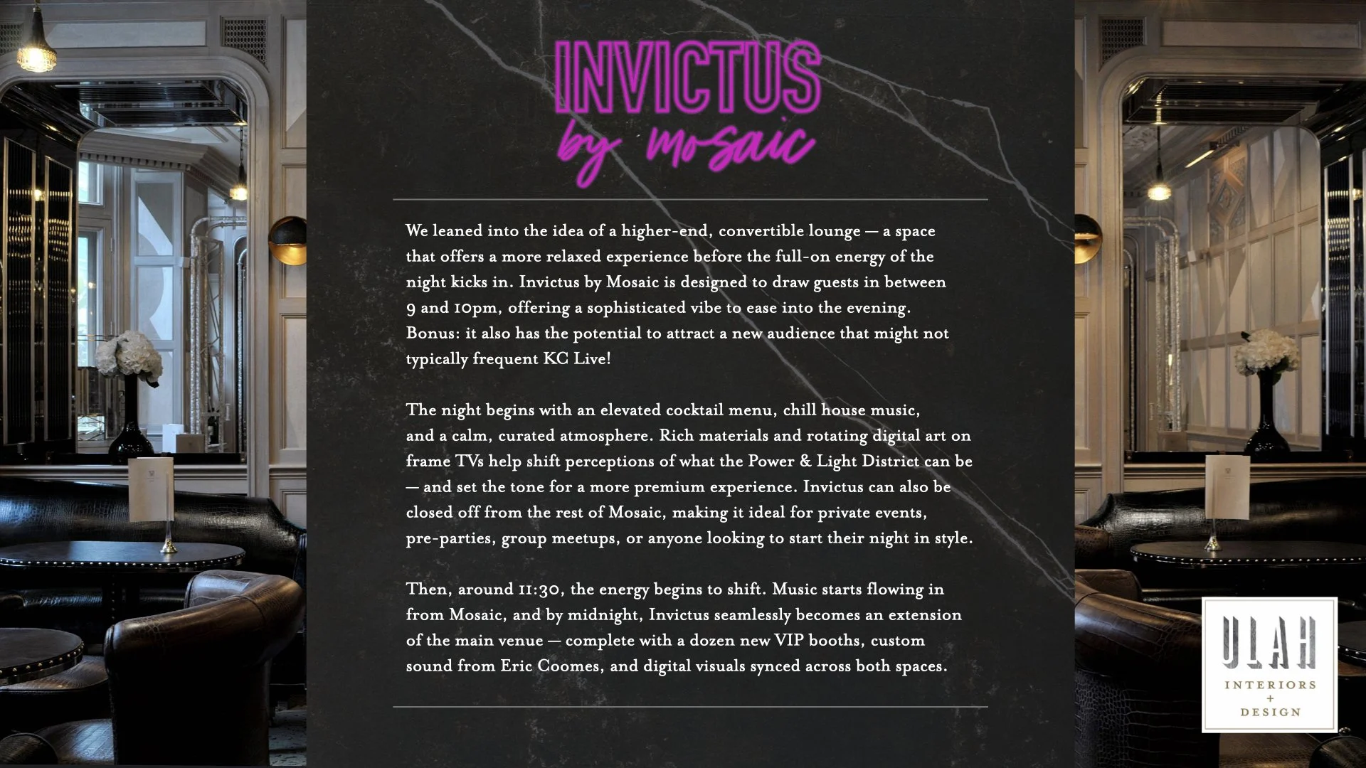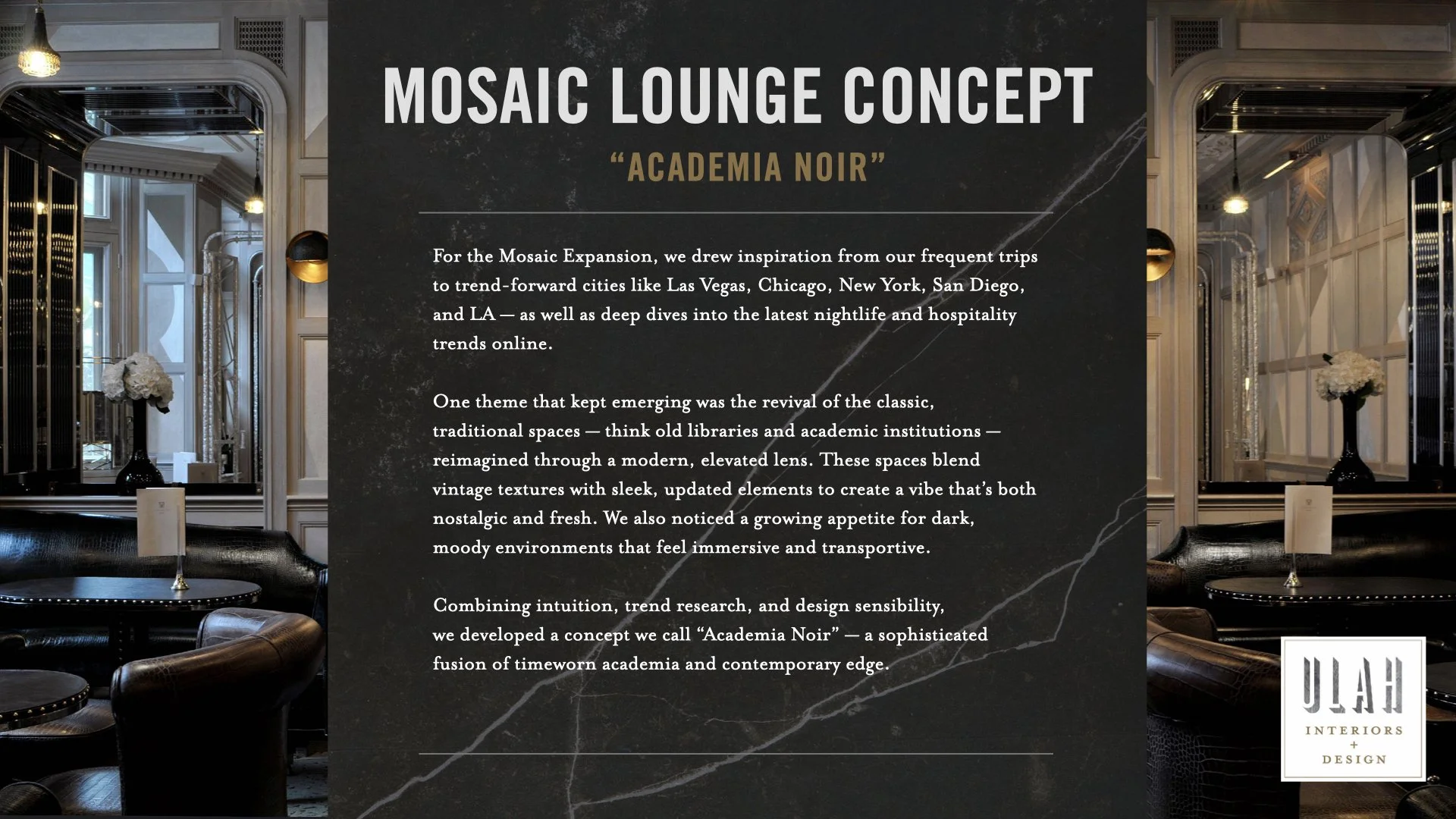 Hired by The Cordish Companies to concept Mosaic’s expansion, I created Invictus by Mosaic — a moody, elevated lounge inspired by vintage academia and reinterpreted for modern nightlife. Starting with trend research and travel inspiration, I developed a high-concept vision that blended narrative and spatial design. From guest journey mapping to material palettes and 3D renderings, the project pushed the boundaries of how nightlife could feel: layered, intellectual, and culture-forward.