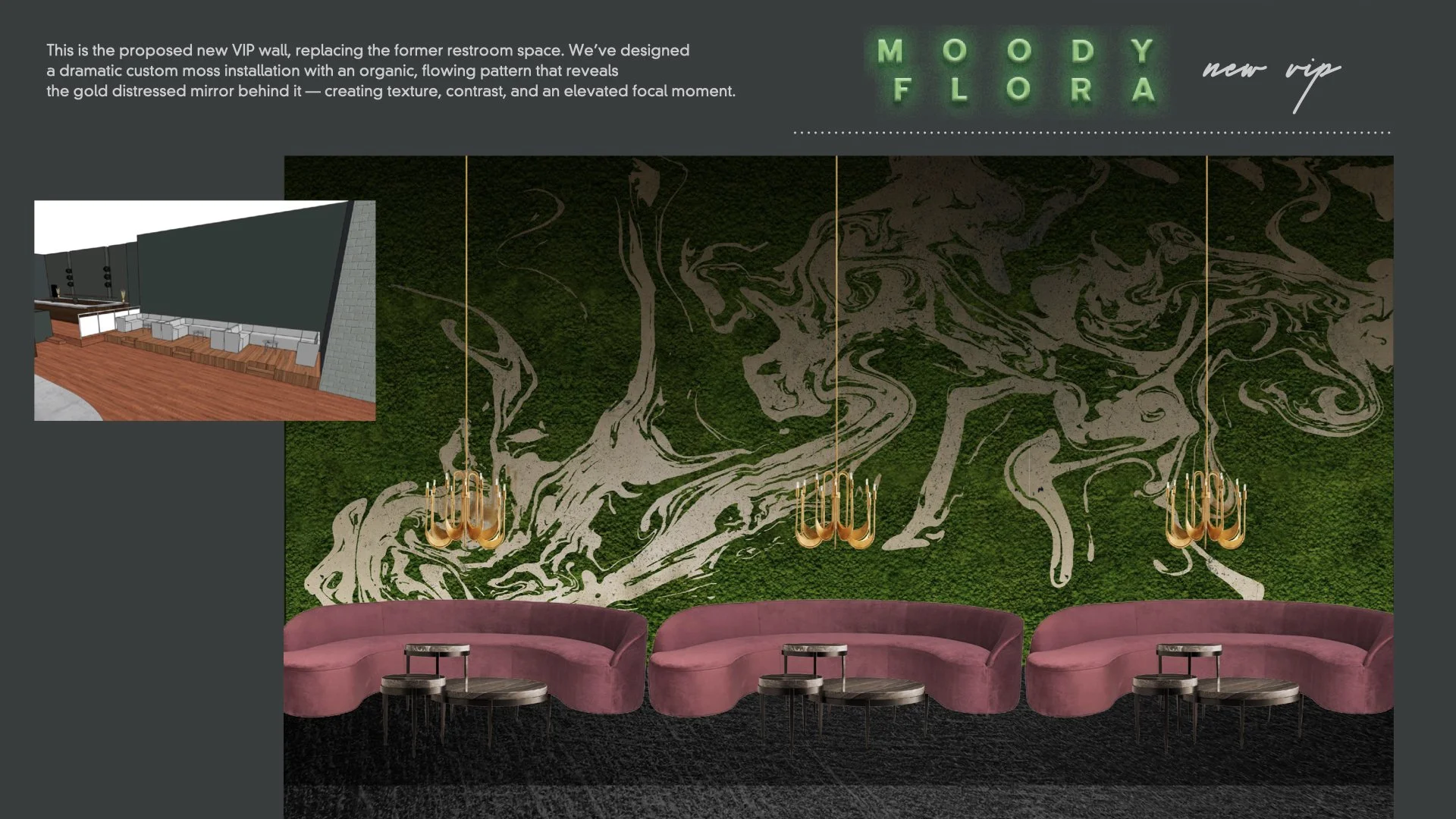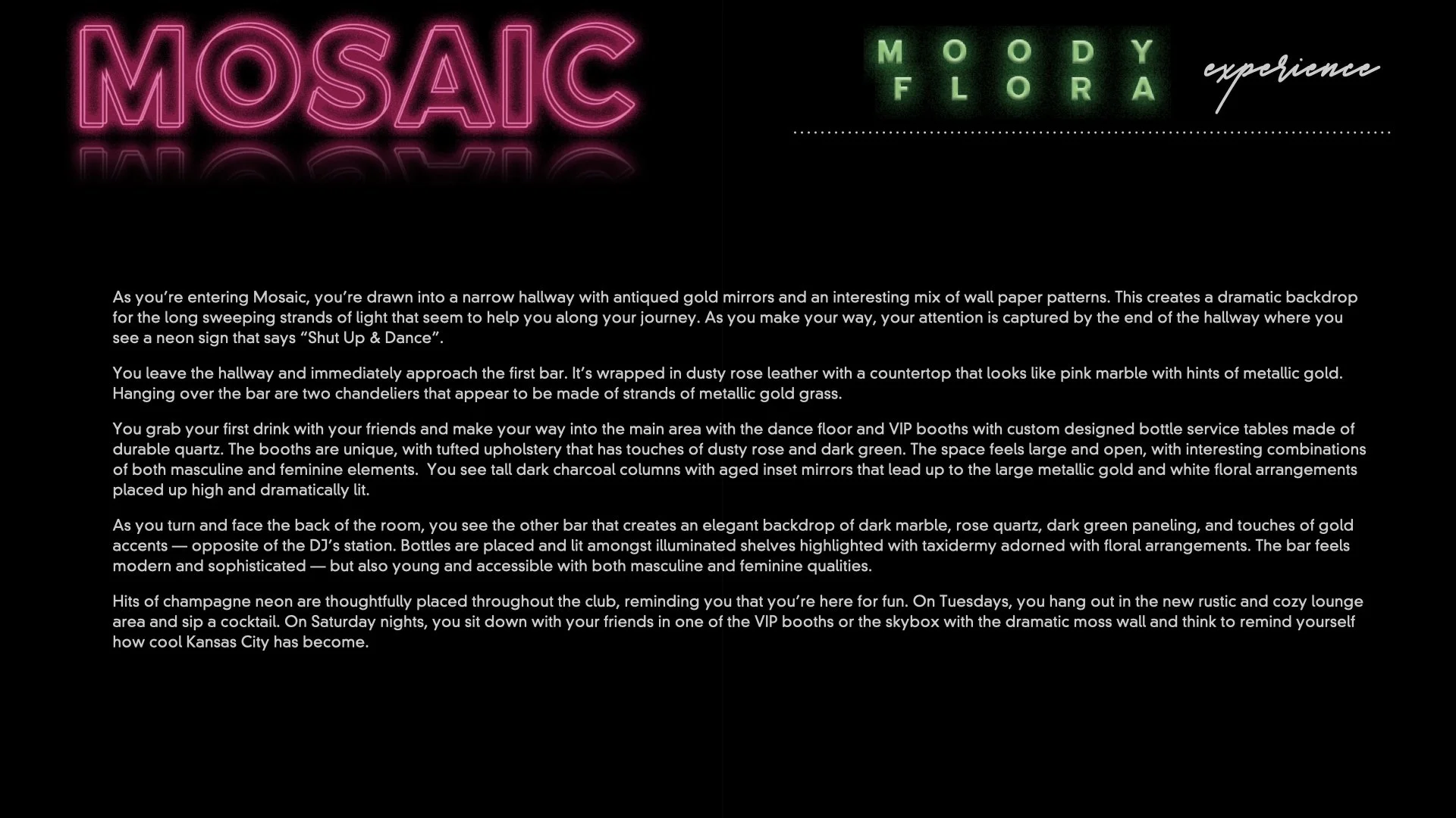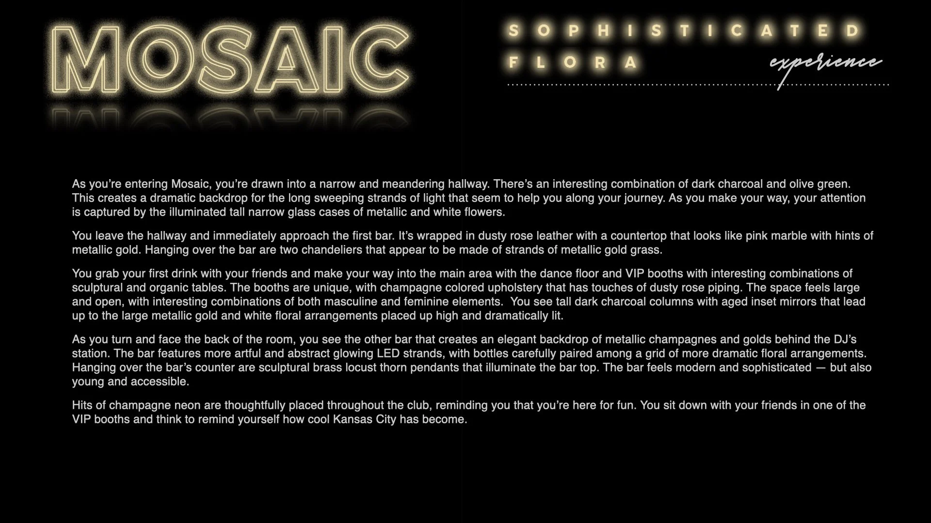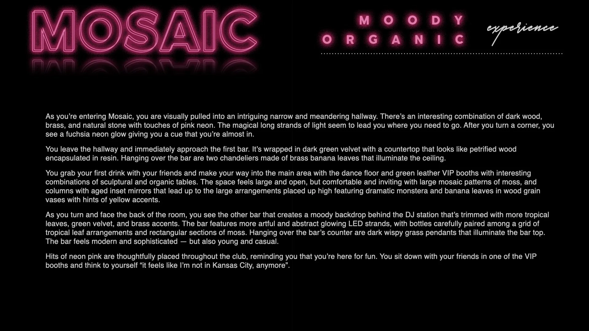 For The Cordish Companies, I was brought in to reimagine Mosaic nightclub as more than just a venue — but as an emotionally immersive, cultural destination. My role was to explore boundary-pushing concepts that blended hospitality, fashion, and experiential design into a guest journey with real impact. From layered lighting moments to material palettes and atmospheric details, I mapped out how every touchpoint could heighten emotion and create a sense of energy. The result was a bold, vibe-forward vision designed to spark culture, amplify connection, and leave a lasting impression.